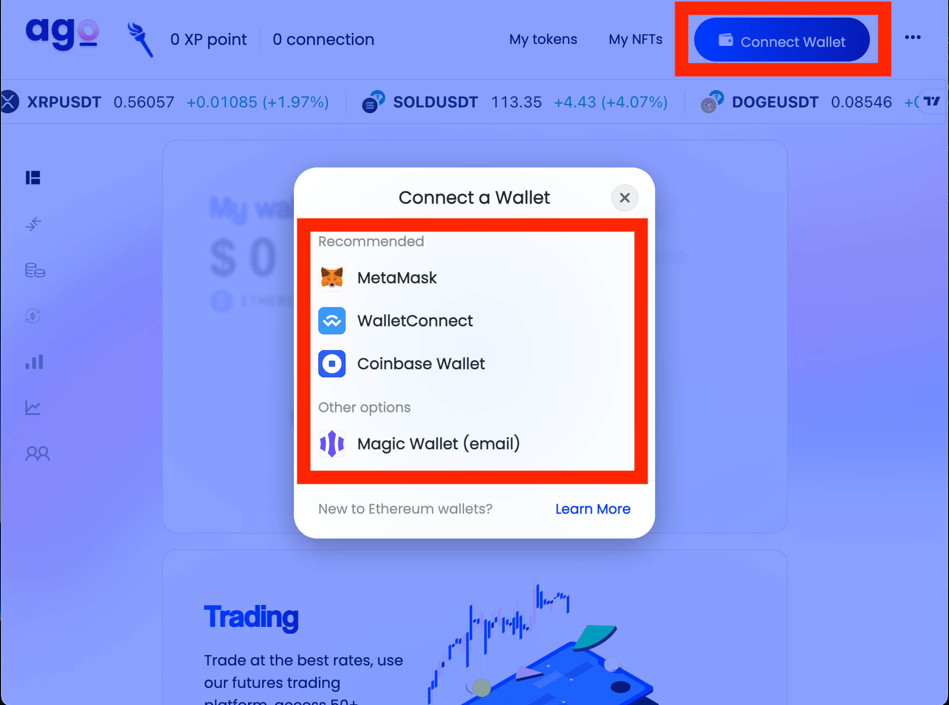 Alternatively, you can use Magic Wallet for easy connection (using your Google details or email address).&#x20;